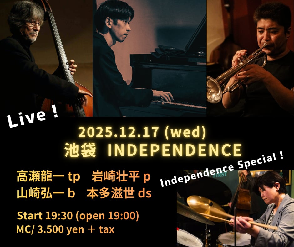 本多滋世INDEPENDENCE Special カレンダー 日時: 2025-12-17 @ 7:30 PM 2025-12-17T19:30:00+09:00 2025-12-17T19:45:00+09:00 参加費: M.C.¥3500 本多 滋世(dr) 高瀬 龍一(tp) 岩崎 壮平(p) 山﨑 弘一(wb) MC¥3500