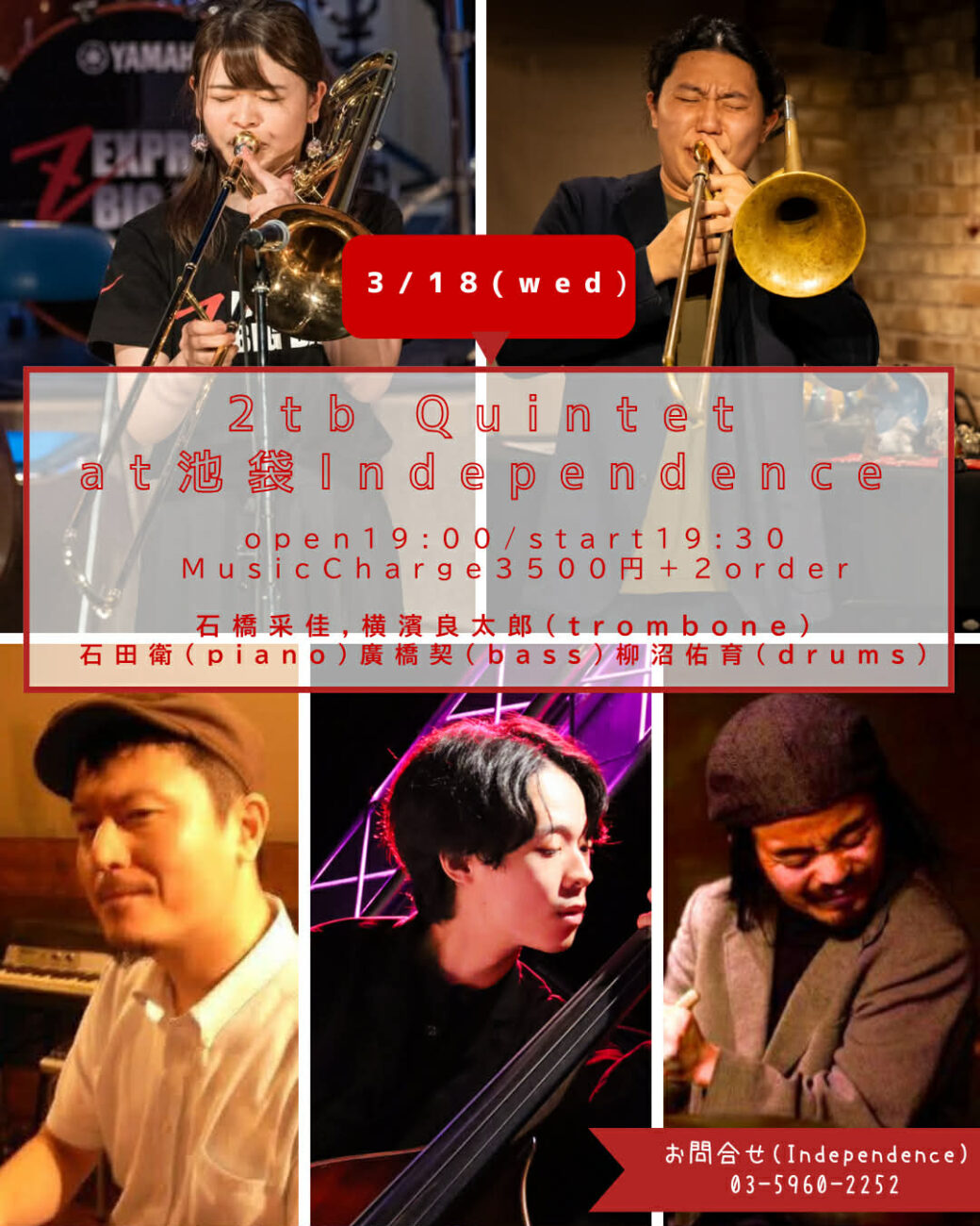 2tb Quintet カレンダー 日時: 2026-03-18 @ 7:30 PM 2026-03-18T19:30:00+09:00 2026-03-18T19:45:00+09:00 参加費: M.C.¥3500 横濱 良太郎(tb) 石橋 采佳(tb) 石田 衛(p) 廣橋 契(wb) 柳沼 佑育(dr) MC¥3500